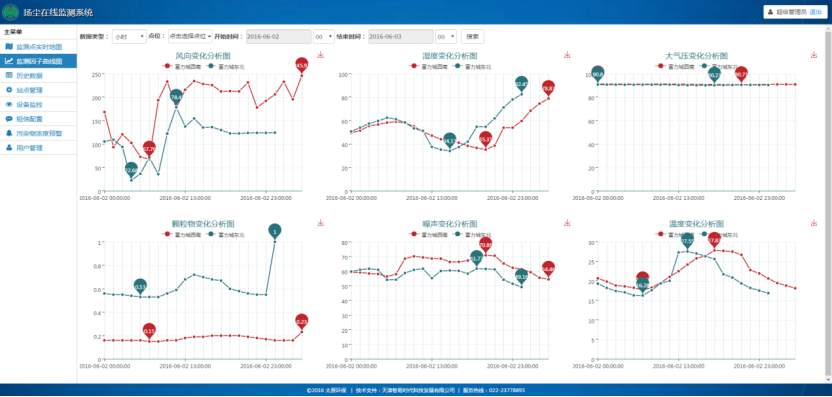 可结合电子地图确切的知道每个设备所在位置,通过点击电子地图上的设备图标就可以查看设备所带各项传感器采集的实时监测因子,包括颗粒物、气象参数、视频等,双击视频播放界面可以实现放大或缩小,方便用户直观查看区域内所有监测点的部署情况和环境质量状况。