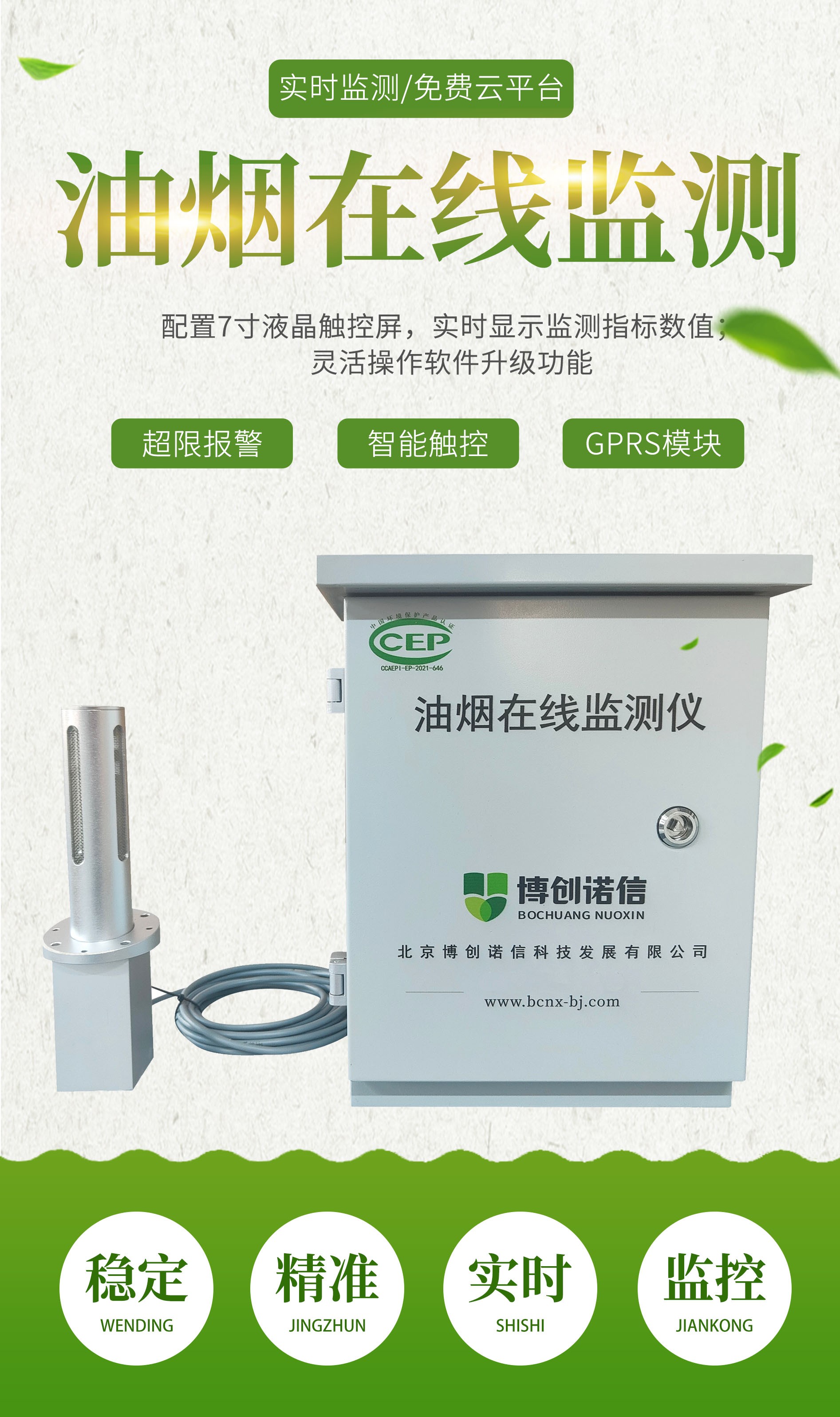 北京博创诺信科技针对餐饮业生态环境保护的提高,自主研发生产的BCNX-YY08油烟在线监测仪是我公司基于多年的数据采集经验,和对油烟监控系统的深入理解,经过大量的实验和测试,最终研制出的一款远程控制型油烟数据采集器。相比于传统的监测设备只能简单监控油烟净化系统的各个设备的开停状态,本产品采用全新的技术,不仅能实时监测和上报油烟浓度、温度及湿度等数据,而且还能监测油烟净化系统内各个设备的运行状况并实时控制,为环保局提供真实有效油烟监测数据的同时,也为各餐饮企业提供了更加便捷的远程操控净化设备的手段,从而真正达到油烟在线监控的目的。